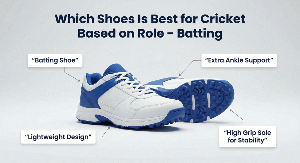 Batsmen need shoes that are lightweight and provide ankle support for quick singles and stability while playing strokes.